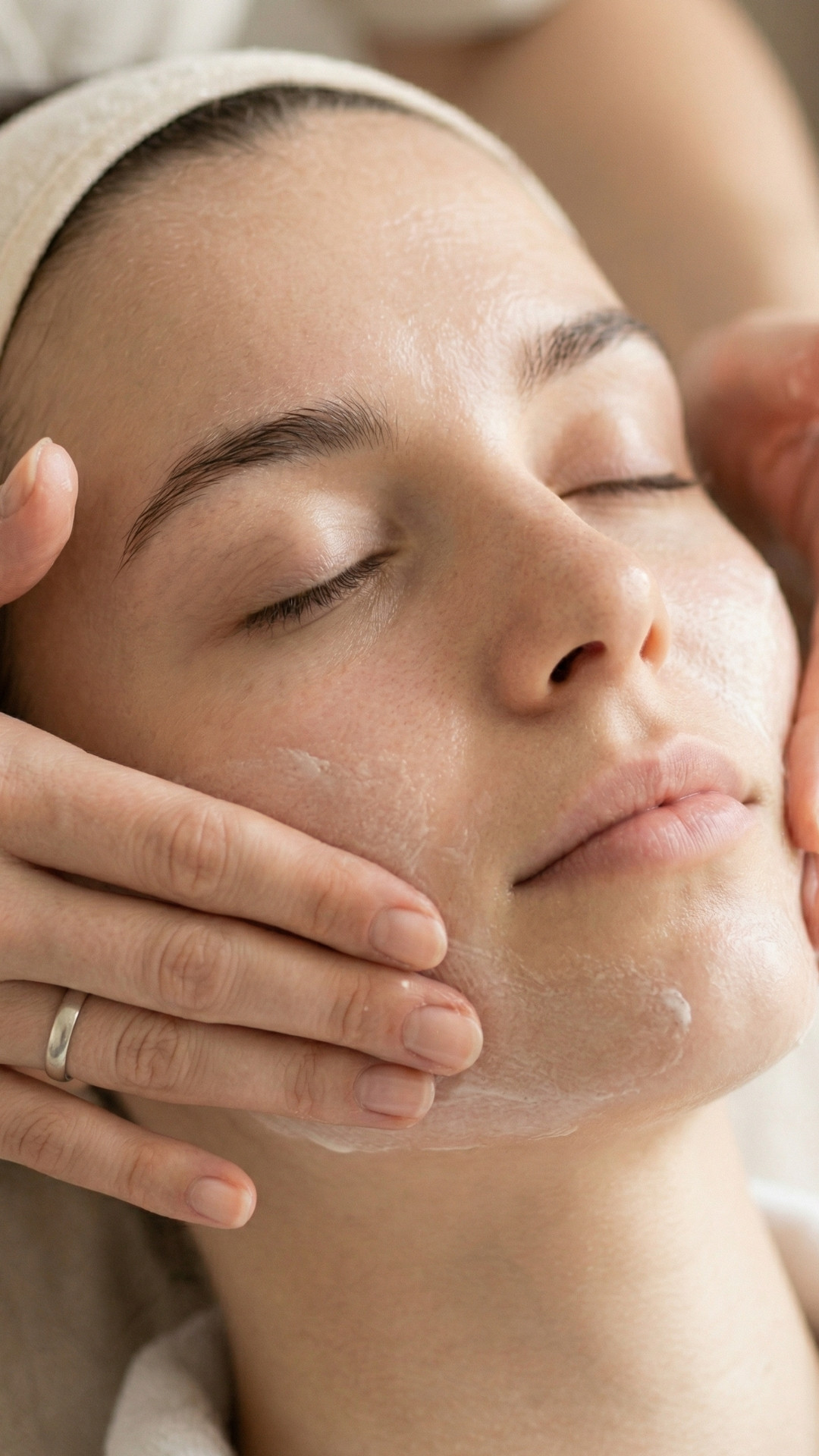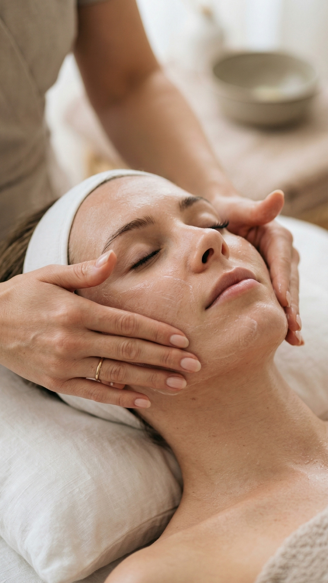 Terapeuta aplicando masaje Kobido en rostro femenino relajado